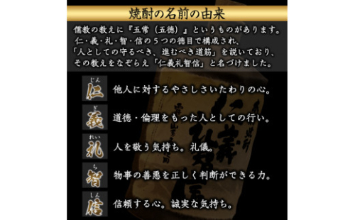 『仁』『義』『礼』『智』『信』の5つの徳目で構成され、「人としての守るべき、進むべき道筋」を説いており、その教えをなぞらえ私どもが取り扱うの焼酎に「仁義礼智信」と名づけました。