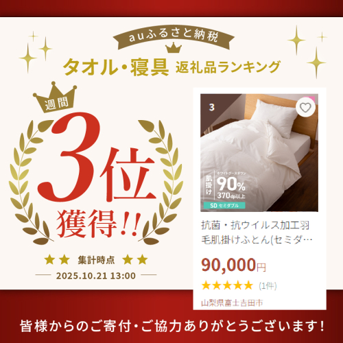 抗菌・抗ウイルス加工羽毛肌掛けふとん(セミダブル)【甲州羽毛ふとん】
