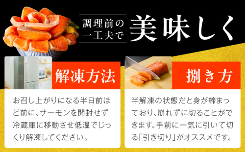 家族がサーモン大好きなのでいくつかの返礼品をいただいていますが、ポーションで届くため用途に応じて好みの大きさに切り分けられて重宝しています。お刺身でももちろん美味しいですしお料理の味付けをしてもサーモンのお味がしっかりしていて満足できます。たぶん、リピートすると思います。