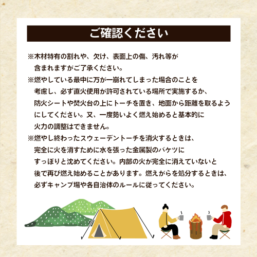 香川県東かがわ市の山林で伐採された、間伐材を利用したスウェーデントーチです。 スギやヒノキなどの針葉樹の間伐材は、山に放置されたまま行き場が無いのが現状です。 そうした間伐材を利用することにより、地域林業の活性化、森林環境の改善に繋がります。 キャンプでは、焚火は勿論、トーチの上に鍋やフライパンを乗せて調理に使用が可能。 又、災害時には暖もとれて燃料にもなり、ベンチとしても活用できるので災害備蓄品としてお持ちいただくことをお勧めします。 ※注意事項をご一読いただき安全に使用してください。