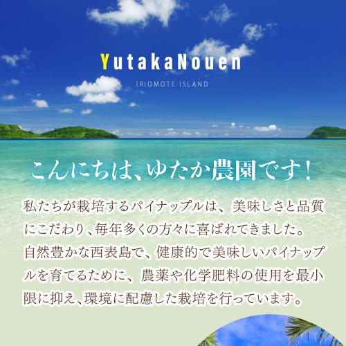 ピーチパインは小ぶりで桃の甘い香りを漂わせ、乳白色の果肉にギュッと詰まった濃厚な甘味が特徴です。西表島の豊かな自然と太陽の恵みを受け、真心をこめて育てました。香り豊かな甘くて美味しい「ゆたか農園の完熟ピーチパイン」を産地直送でお届けします。どうぞご賞味ください。冷蔵庫で冷やしてお召し上がりください。
