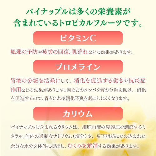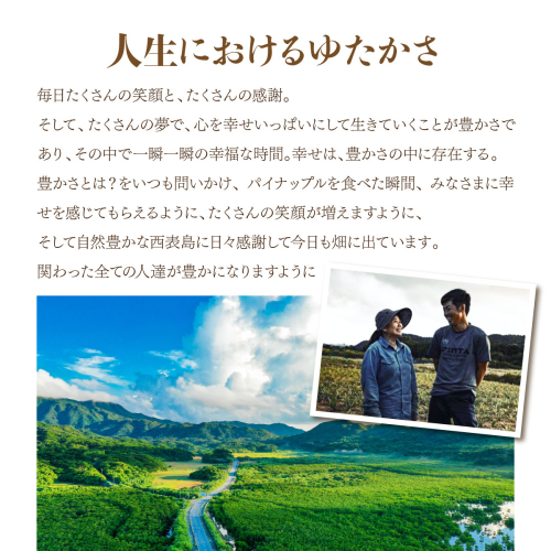 ピーチパインは小ぶりで桃の甘い香りを漂わせ、乳白色の果肉にギュッと詰まった濃厚な甘味が特徴です。西表島の豊かな自然と太陽の恵みを受け、真心をこめて育てました。香り豊かな甘くて美味しい「ゆたか農園の完熟ピーチパイン」を産地直送でお届けします。どうぞご賞味ください。冷蔵庫で冷やしてお召し上がりください。 ※画像はイメージです。 ※出荷時期になりましたら、別途メールにてお届けについてのご案内をさせていただきます。 ※発送時期は、例年の発送時期になっております。天候や収穫状況によりお届けが遅れたり、早まることがあります。また、手配ができない場合は別途ご連絡させていただく場合がございます。 ※お客様の都合により商品を受け取れなかった場合、または受け取りまでに期間がかかった場合は、生鮮品につき返品・再配送は致しかねますので予めご了承ください。 ※収穫時期が限られてる為、日時指定は致しかねますので予めご了承ください。 ※大きさにより数が異なります。 ※商品受取後すぐに商品の状態をご確認し、不良の場合、お問合せセンターまでご連絡ください。お時間が過ぎてからの対応は致しかねます。 ※生鮮品につき、到着後すぐにお召し上がりください。 ※賞味期間(目安):お届けから常温で3日(冷蔵で5日)