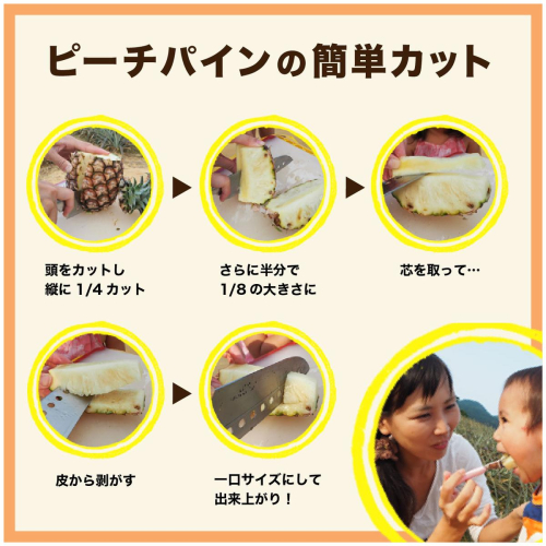 おおきさ不揃いですが、味には自信が有ります。農園の取り組みと技術が認められ、2017年に沖縄県最優秀賞を受賞!また2018年には九州・沖縄地区において優秀賞を受賞した”西表島ひらい農園”がおくるピーチパインは全国の農家さんからも絶賛頂いております。また当農園のピーチパインを100%使用したジュースが食品・飲料のミシュランとも言われる『INTERNATIONAL TASTE INSTITUTE 2021』において最高星数の3ツ星を獲得。”西表島ひらい農園”のピーチパインはパイン特有の酸味やヒリヒリ感が無くと?っても甘いのでお子様に大人気!白い果肉と桃のような香りがする事からピーチパインと名付けられたこのパインは、西表島の太陽の下、すくすくと育っています。植付から収穫まで約2年間すべてを手作業で管理している西表島ひらい農園だからこそ自信を持ってお勧めできるピーチパイン!