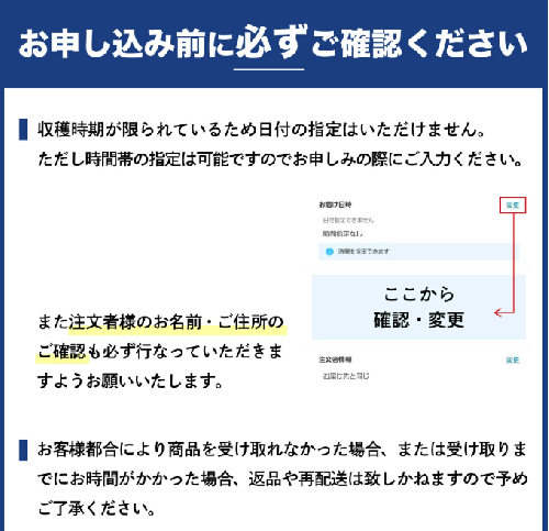 ※お客様の都合により商品を受け取れなかった場合、または受け取りまでに期間がかかった場合は、生鮮品につき返品・再配送は致しかねますので予めご了承ください。