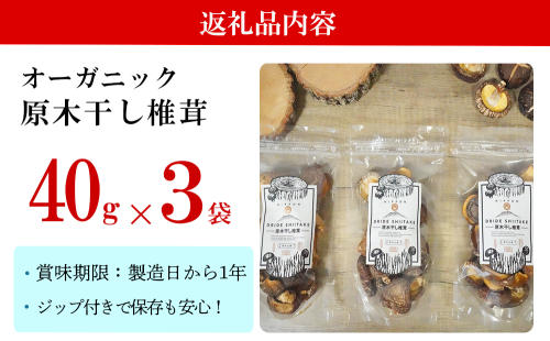 - 宮崎県産 乾燥 椎茸 40g×3袋 チャック袋入 [ HUTTE 宮崎県 美郷町 31ao0012] 干ししいたけ 出汁 オーガニック 原木栽培 有機JAS認証 料理 調理 小分け 常温 渡川 アヒージョ 煮物 煮付け おかず おこわ 鍋 みそ汁 炒め物 うどん そば スープ パスタ リゾット 春巻き 数量限定