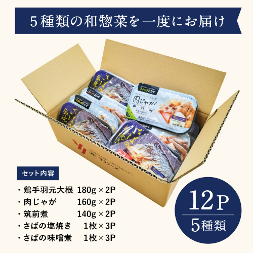 「鶏手羽元大根」「肉じゃが」「筑前煮」「さばの塩焼き」「さばの味噌煮」の5種類を計12パックお届けいたします。