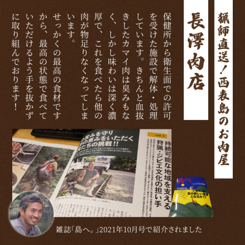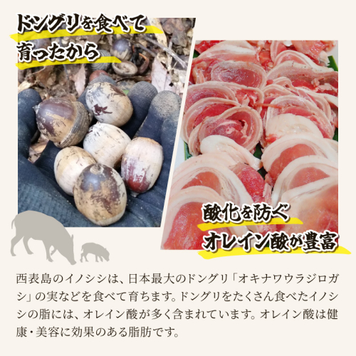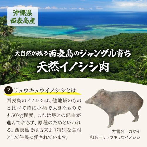 世界自然遺産・西表島のジャングルで、ドングリやシイの実など大自然の恵みで育った天然のリュウキュウイノシシ肉です。