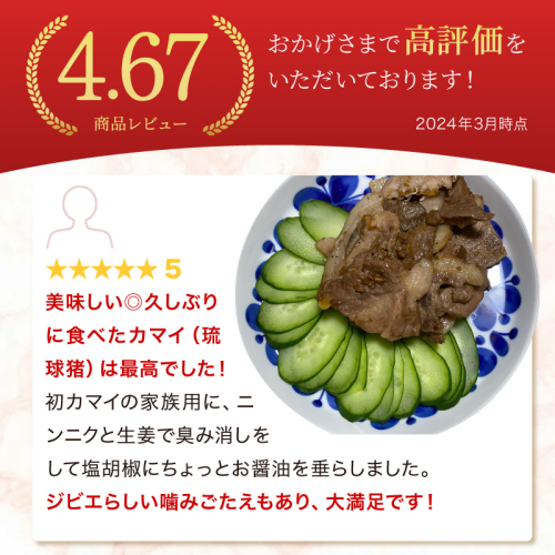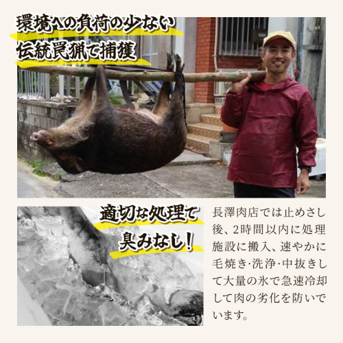 世界自然遺産・西表島のジャングルで、ドングリやシイの実など大自然の恵みで育った天然のリュウキュウイノシシ肉です。 西表島ではカマイと呼ばれ、地域のお祝いには欠かせない重要な食材として住民に愛されています。そんなカマイを100年前から変わらず伝わる伝統的なわな猟で捕獲しました。 捕獲したイノシシのストレスを最低限に抑えるため通常より頻繁に罠の見回りを行なっています。 捕獲後は最短時間で急速冷却し、清潔な施設で下処理を行なった後、約1℃の低温で2~3日間熟成し、加工処理して真空パックで冷凍後、お届けいたします。迅速・適切な処理で臭みはありません。 商品内容は様々な部位のスライスをミックスしており、焼き肉やしゃぶしゃぶなど色々な料理にご利用頂けます。 滋味溢れる食材本来の味わいのために塩やしょう油などシンプルな味付けをお勧めします。 ※画像はイメージです。 ※天然物ですので個体差があります。 ※自然の産物のため、捕獲状況によってはお届けまで予定日数より数ヶ月お待たせする場合があります。 事業者:長澤肉店