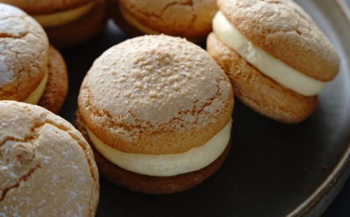 ふわふわメレンゲ生地に、濃厚で滑らかなカスタードクリームがたっぷりと詰まっています。一口食べれば、口の中に広がるカスタードの香りと、クリームの濃厚な味わいが心地良く広がります。