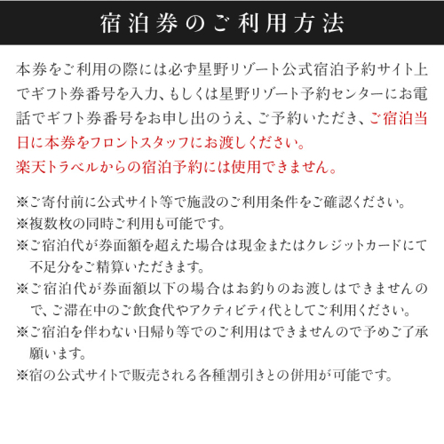 〇本券をご利用の際には必ず星野リゾート公式宿泊予約サイト上でギフト券番号を入力、もしくは星野リゾート予約センターにお電話でギフト券番号をお申し出のうえ、ご予約いただき、ご宿泊当日に本券をフロントスタッフにお渡しください。