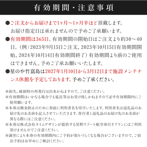 〇本券は株式会社タイムデザインが提供する星野リゾート航空券付きプランにはご利用頂けませんのでご注意ください。