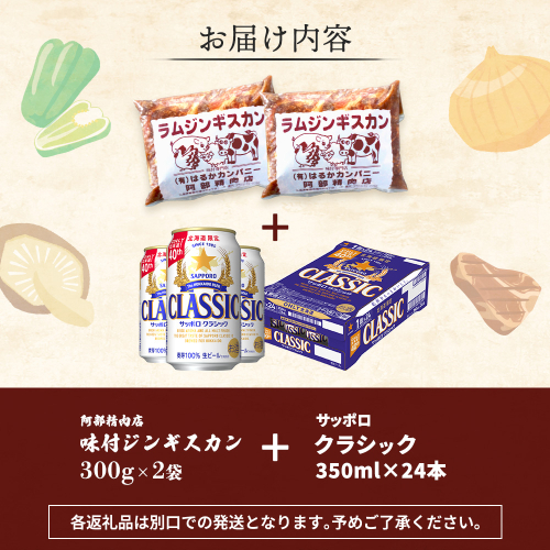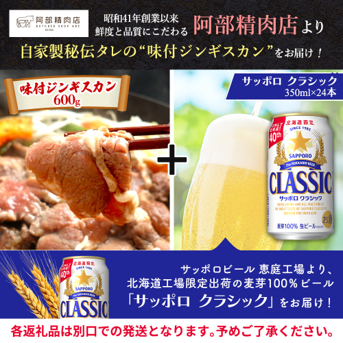 阿部精肉店 味付き ジンギスカン 600g サッポロクラシック ビール 350ml 24本 ふるさと納税 北海道 恵庭 コラボ サッポロビール クラシック ラム肉 味付き 羊肉 ジンギスカン 生ビール 恵庭市 北海道限定
