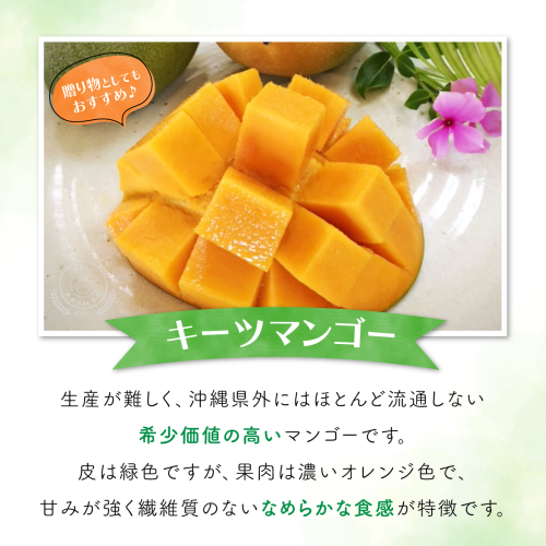 「幻のマンゴー」と呼ばれるキーツマンゴー!日本で栽培されている9割以上が赤色のアップルマンゴーで、 キーツマンゴーは生産量が非常に少なく、沖縄県外にはほとんど流通しない貴重なマンゴーです。見た目は緑色ですが、果肉は濃厚なオレンジ色で平均糖度は14度と高く、繊維質のないなめらかな食感が特徴です。見た目からは想像できない濃厚なあまみでマンゴー通からも人気な品種です。収穫時期は8月以降となりますので、お中元のお返しや仏壇のお供え用の贈り物としてオススメです。