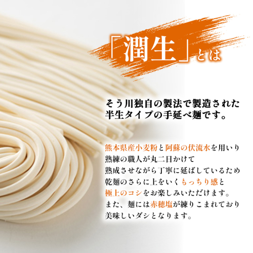熊本県産小麦粉を用いた手延べうどんでツルツルもちもちの食感が特徴です。特製つゆが付いています。
