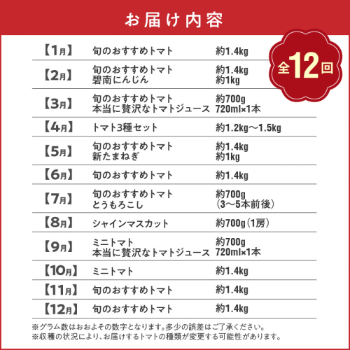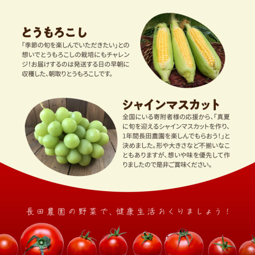 - 個数限定 長田農園 旬 スペシャル 定期便 毎月発送 12回 トマト ミニトマト トマトジュース 野菜ソムリエサミット 金賞 さくらんぼトマト トマトベリー 国産 野菜 詰め合わせ とうもろこし シャインマスカット にんじん 新たまねぎ 愛知県 碧南市 送料無料 H004-168