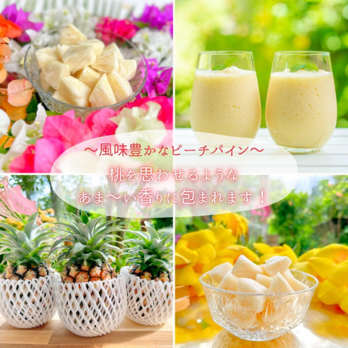 桃を思わせるような香りのするピーチパインは600g?800g程度と小ぶりな品種です。果肉は乳白色で柔らかく果汁もたっぷりジューシー!熟すと芯の部分まで食べることができます。濃厚な甘さとほど良い酸味が特徴の風味豊かなパイナップルです!