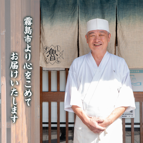 【鯖押し寿司】 脂のノリがよく臭みがなく、甘みがあるのが特徴の『むじょかさば』と、自然が豊かな霧島産のお米に、コクがあり、さっぱりとした種子島産きび糖と 鹿児島県産と瀬戸内産を調合した塩と霧島市福山産の黒酢を使ったシャリで押し寿司を作りました。 こだわり抜いた鹿児島県産の食材で作った洗練された押し寿司を、是非ご賞味ください。 《解凍方法》 箱から取り出し、室温20度~25度前後で約5時間~7時間程置いて自然解凍で召し上がりください。 ※直射日光は避けてください。 ※冷蔵庫での解凍は行わないでください。 《原材料名》 【鯖押し寿司】 鯖(鹿児島県産)、米(鹿児島県産)、きび糖、醸造酢、海塩、昆布(北海道産)、醤油(醤油さし入り)、生姜(がり) 《アレルギー表示》 さば 《賞味期限》 製造後、冷凍保存で60日以内 ※解凍後はお早めにお召し上がりください。 すし魯くら 0995-45-0250 《地産理由》 霧島市内の寿司店で製造された押し寿司(全商品)