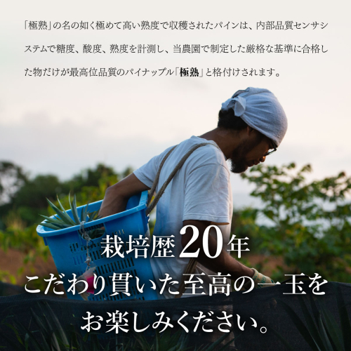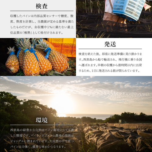 西表島パイランドファームの約15ヘクタールに及ぶ広大なパイン畑の中から,樹の生育の状態、実の大きさ、形が特に優れたパインを選抜し、樹上で成熟させます。西表島の豊かな大自然の中で、日々太陽を浴び、成熟のピークとなったパインは、当農園の熟練したスタッフにより収穫されます。毎日畑に通い、樹上のパインを観察し、収穫のタイミングを見極めることはかなりの経験を要します。「極熟」の名の如く極めて高い熟度でパイン収穫されたパインは、内部品質センサシステムで糖度・酸度・熟度を計測し、当農園で制定した厳格な基準に合格した物だけが最高位品質のパイナップル「極熟」 と格付けされます。こだわり貫いた至高の一玉をお楽しみください。