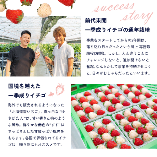 世界中の人が望んでいる、この美味しいイチゴを「もし1年中作ることができたら?」そんな夢を実現し、アメリカや東南アジアなどの国外を中心に輸出をし、国内においても東京・大阪・札幌の市場や百貨店等でも大人気の「北海道ゆきいちご」。