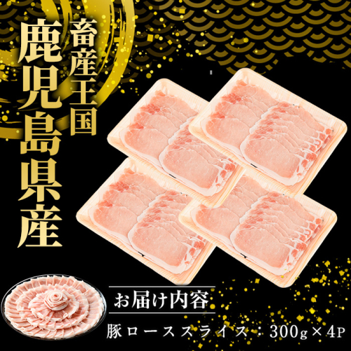 鹿児島県産の豚ローススライス300gを4パックのボリュームでお届けします。 豚ロースを贅沢に1.2kg入り(300g×4パック)と大家族も満足のボリュームです。  300gの小分けトレーなので人数や使用用途で分けて使えます。 薄切りなので、しゃぶしゃぶ、生姜焼き、ミルフィーユカツ、炒め物、多彩な用途で使えます。 畜産王国鹿児島県の豚肉をお召し上がり下さい。 【※ご寄附前に必ずご確認ください】 到着後は速やかに返礼品の状態をご確認ください。 万全を期して返礼品をお届けしていますが、万が一、不備等があった場合は返礼品到着から2日以内に、写真(画像)を添付のうえ、電子メールにてお問合せ先までご連絡ください。 日数が経ったものに関しましては対応いたしかねます。 ご了承の上、お申込みくださいますようお願い申し上げます。