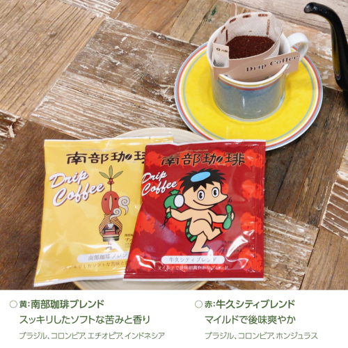 ドリップコーヒーバッグ「南部珈琲ブレンド」は、ブラジル・コロンビア・エチオピア・インドネシアの豆をブレンドしたすっきりとした苦みと香りのコーヒーです。