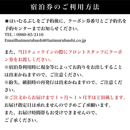 〇はいむるぶしをご予約後に、クーポン券番号とご予約名を予約センターまでお知らせください。