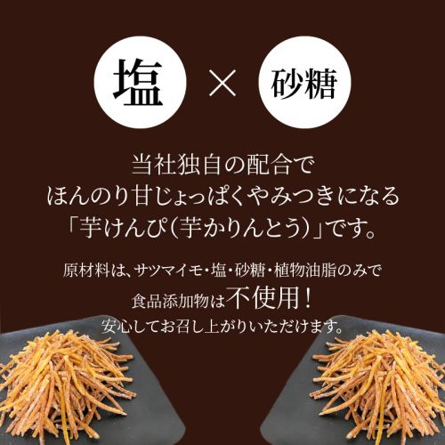塩と砂糖を当社独自の配合で、ほんのり甘じょっぱくやみつきになる「芋けんぴ(芋かりんとう)」です。