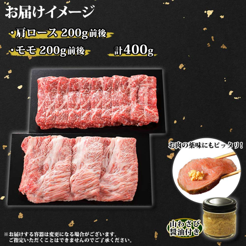 - 2538. 霜降り 黒毛和牛 A4 A5 カタロース 赤身 モモ 赤身 セット 計400g前後 牛肉 肉 牛 和牛 山わさび 送料無料 北海道 弟子屈町