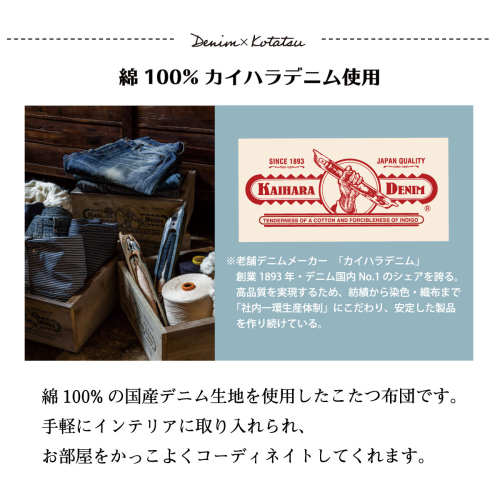 こだわりの国産デニムを使用したこたつ布団です。  国産デニム生地綿100%だから安心で、しっかり丈夫な素材です。デニムの風合いを残しつつ、色落ちしにくい染め方やソフト仕上げ加工を施しています。