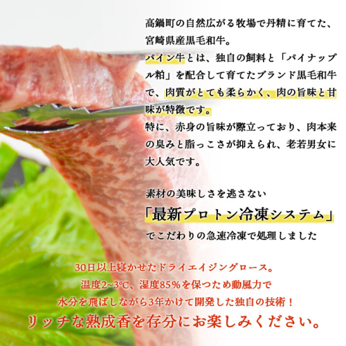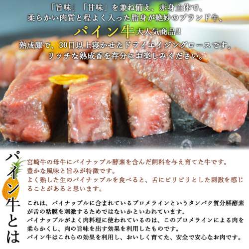 「旨味」「甘味」を兼ね備え、赤身主体で、柔らかい肉質と程よく入った脂身が絶妙のブランド牛(パイン牛)大人気商品!!熟成庫で30日以上寝かせたドライエイジングロースです。 ----------------------------------- 原材料名 宮崎県産黒毛和牛 保存方法 冷凍 ギフト対応 ※のし等のギフト対応をしておりません。ご了承ください。 【地場産品に該当する理由】 高鍋町内で育ているパイン牛のお肉のため。(告示第5条第1号に該当)