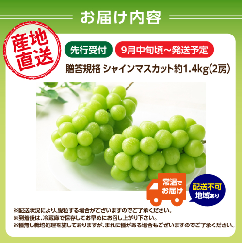 • 《先行予約》贈答規格シャインマスカット 約1.4kg(2房)【2025年9月中旬頃~発送予定】【山形ぶどう・大江町産・小林葡萄園】 【024-003】