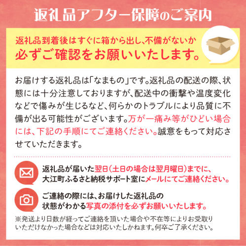 返礼品到着後に果実に傷みが確認された場合は、アフター保証の内容に基づき対応させていただきます。