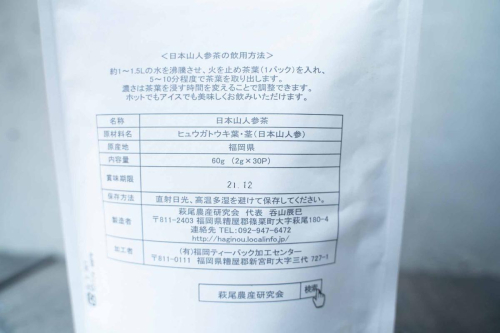 現在栽培している日本山人参(ヒュウガトウキ)は、農薬を使わず栽培し、収穫-洗浄‐炭火焙煎の加工を手作業にて丁寧に行なっています。その効用とくせになる苦みに惹きつけられた若手メンバーも加わり、より良い商品づくりを目指して、栽培から商品開発まで日々研究しています。 自然豊かな萩尾が、子供から大人まで健やかに生活できる魅力ある地区であり続けることを目指し、この風味豊かなお茶が「篠栗の特産品」として多くの方々に届くことを願っています。