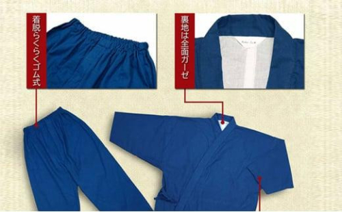 デザインは見た目も心も引き締まる作務衣タイプで、定番カラーの紺色はちょっとしたお散歩にも上品に着て頂けます。