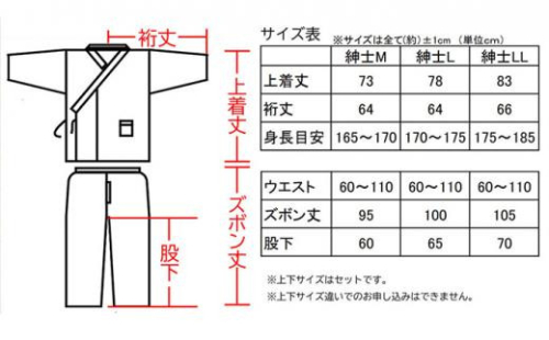 M=身長目安(165~170cm)、上着丈(73cm)、裄丈(64cm)、ズボン丈(95cm)、ウエスト(60~110cm)、股下(60cm)