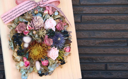 ウッドボードにドライフラワーやプリザーブドフラワーを使いラウンド型にして置き型、壁掛けにも出来るフラワーインテリアです。