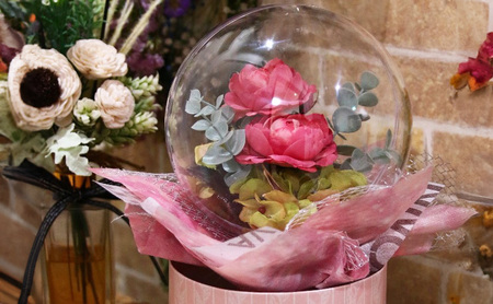 アーティフィシャルフラワーをアクリル製のバルーンの中に入れたフラワーアレンジです。
