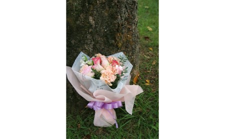 ふわふわピンク系のコロンと丸い可愛らしいラウンドブーケです。日頃の感謝の気持ちや自分のご褒美にも、お花を飾ってみませんか?