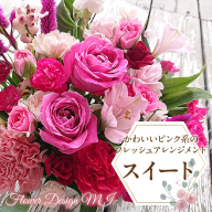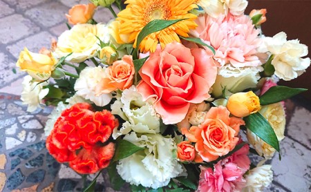 季節のお花に、バラやカーネションなどを用いた華やかな雰囲気のアレンジです。花瓶などのご用意もなくそのまま飾れます。お誕生日、お祝い、記念日のプレゼントとしてもオススメです。 事業者:Flower Design MI-