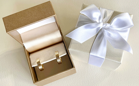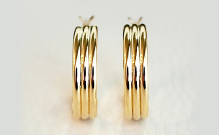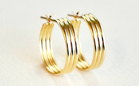 K18イエローゴールドのボリューミーなフープピアスです。 3本のラインがしなやかな煌めきを放ち、ボリューム感もあるので存在感があります。 コーディネートのアクセントとして耳元を華やかに彩ってくれるでしょう。 見た目以上に軽やかな造りは技術の見せ所です。 ケースに入れ、リボンをかけてお届けいたします。