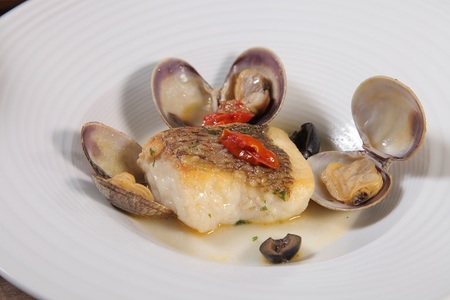 【アクアパッツア】真鯛、あさり、白ワイン、水、ニンニク、ドライトマト、オリーブ油、ケッパー、ブラックオリーブ、タイム、塩