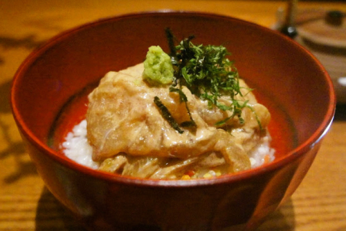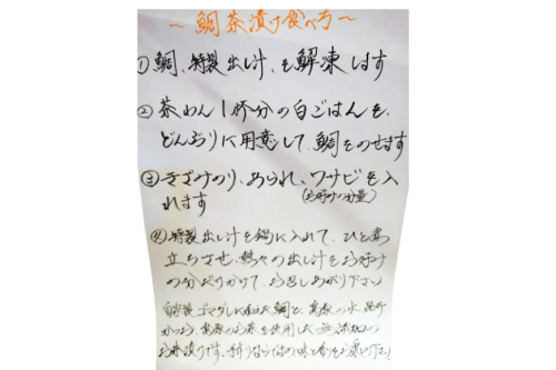 自家製ゴマだれで和えた鯛と島原の水、昆布、かつお、島原のお茶を使用した無添加のお茶漬けです。