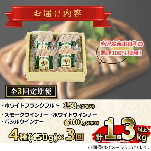 【0335104b】<定期便・全3回>鹿児島黒豚無添加ソーセージ(ウインナー・フランクフルト)の詰合せ(4種×3回・合計42本)国産 黒豚 豚肉 ぶた肉 ソーセージ フランクフルト スモーク【鹿児島ますや】