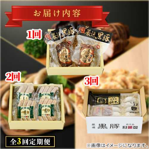【0355105b】<定期便・全3回>無添加鹿児島黒豚だらけの定期便(炭火焼豚 400g・ソーセージ4種 合計14本・餃子 計36個)黒豚 豚肉 ぶた肉 炭火焼豚 焼豚 フランクフルト 餃子 セット【鹿児島ますや】
