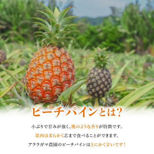沖縄本島から南西約400km、沖縄県竹富町「西表島」は気温・土壌共にパイナップルの栽培に最適の地域です。その環境で育ったパイナップルが国内で販売されるのは1%以下。また、植付から約2年間かけて栽培し、1つの株から1玉しか収穫できない為大変希少な果実です。アララガマ農園のピーチパインはとにかく甘い!酸味が少なく桃の香りがし、柔らかい果肉が人気のパインです。また、当農園ではエコファーマーを取得しており、可能な限り低農薬、減農薬を心がけております。収穫の1年前からは一切農薬と肥料を使用しないので、安心してお召し上がりいただけます。大自然の中で大地の恩恵をたっぷりと蓄えた自慢のパイナップルをぜひご賞味ください。