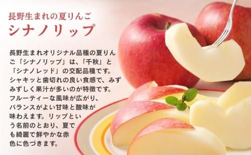 【配送不可:沖縄県・離島】 長野県果樹試験場で育成された「シナノリップ」は、着色もよく、さわやかな酸味と甘味のバランスも良く、ジューシーな果汁がある夏りんごです。 長野県で生まれた品種「シナノリップ」の美味しさを是非味わってみてください。