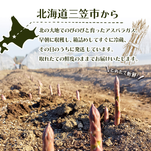 日当たりのよい小高い山の上で育った朝採れのアスパラガスです。もみ殻燻炭や魚粉などを原料にした完熟堆肥をたっぷり使用し、味と鮮度にこだわったアスパラガスです。