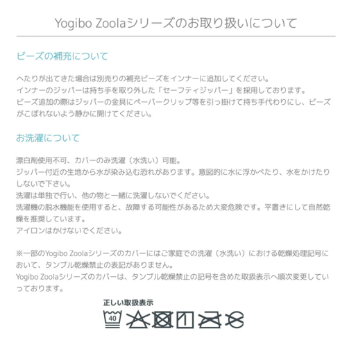 ※新品のYogiboは、新しいビーズ特有の科学的なにおいがすることがあります。人体に害のあるものではございません。通常、数日~1ヵ月ほどでにおいはなくなりますが、においが気になる場合は風通しの良い場所にしばらく置いてください。