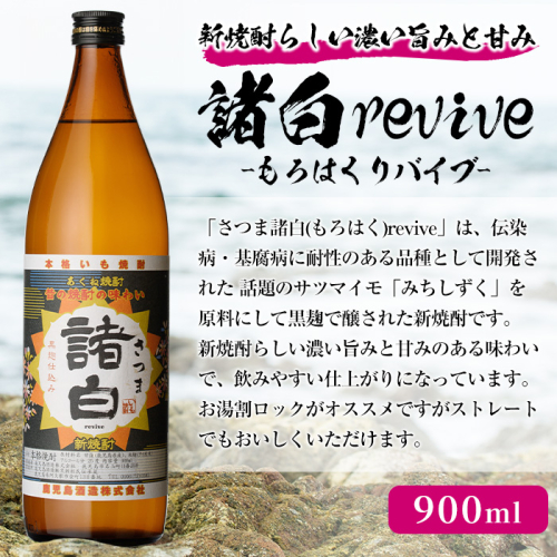 「さつま諸白(もろはく)revive 新焼酎」は、サツマイモの伝染病・基腐病に耐性のある品種として開発された 話題のサツマイモ「みちしずく」芋を原料にして黒麹で醸された新焼酎です。
