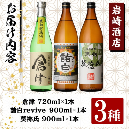 本格焼酎!黒麹セット「倉津(720ml)」「諸白revive(900ml)」「莫祢氏(900ml)」(合計3本)黒麹仕込み 国産 焼酎 いも焼酎 お酒 アルコール 水割り お湯割り ロック【岩崎酒店】akn019-18